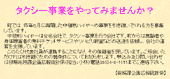 中頓別町ホームページの「町からのお知らせ」に、「タクシー事業をやってみませんか?」という情報が掲載されています。町内でタクシー事業をしている合名会社の代表社員が退職することになり、この後継者を探しているようです。町としては、高齢者や身体障害者の無料チケットサービスやリハビリ教室などの送迎で利用しているとのこと。