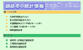 釧路市ホームページに、統計情報のページと、市環境基本計画がアップされています。統計ページには、人口と世帯、産業、学校、市民経済の各分野ごとに、市の統計情報がまとめられています。 |