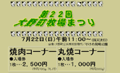 大野町ホームページの「トピックス」に、7月22日開催の「第22回大野町牧場まつり」情報がアップされています。焼肉コーナー、丸焼コーナーの入場券は7月2日から販売するそうです。 |