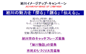 旭川市ホームページに、同市のキャッチフレーズ、「旭川物語」、まちづくりのアイデアをそれぞれ募集する「旭川イメージアップキャンペーン」情報が掲載されています。キャッチフレーズは市民以外の応募もOKです。