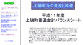 上磯町ホームページに、「平成11年度普通会計バランスシート」が公開されています。作成の経過説明をはじめ、1人当たりのバランスシートや財政分析、詳しい資料などがあります。