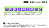 喜茂別町ホームページに、広報「きもべつ」の8月号がアップされ、連載中のシリーズ「市町村合併」のパート6が掲載されています。今回は全国町村会の「市町村合併のあり方に関する意見」を詳しく紹介しています。