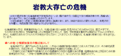 岩見沢市ホームページの7月広報コーナーに、「岩教大存亡の危機」とのタイトルで、北海道教育大学岩見沢が国立大学の構造改革の中、再編される可能性があることなどが説明されています。存知に向けた地元取り組みへの協力を市民に呼びかけています。