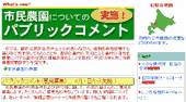 石狩市ホームページに、平成15年5月に開設予定の市民農園の概要と、利用条件および貸付料に関する市の原案、それに対する意見募集のページがアップされています。
