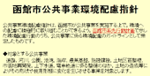 函館市ホームページの環境部のページに、「市公共事業環境配慮指針」がアップされています。市率先行動計画で示した環境配慮行動のうち、公共事業に係る環境配慮のガイドラインだそうです。